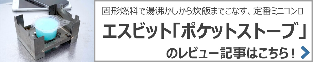 ではいつも通り炊いていきますので、esbitポケットストーブにセットした固形燃料に着火。あとは火が消えるまで放置です。炊き込みご飯のときは、ユニフレームの「バーナーパット(レビュー記事)」を併用すると焦げ付きにくいので便利です。